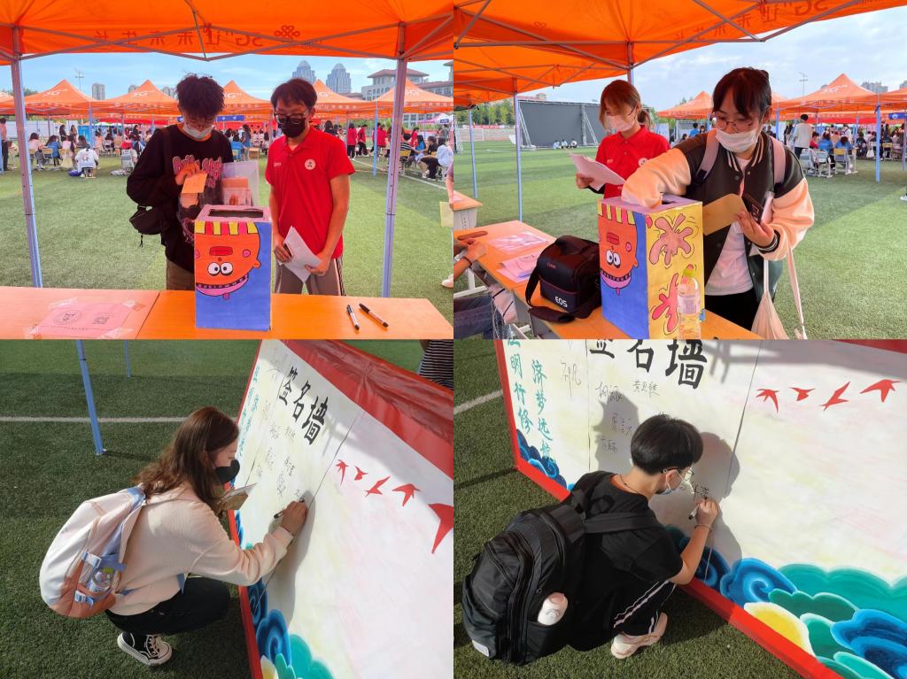学院提倡“以心迎新”,举办抽盲盒和签名墙活动——“第一份幸运”盲盒中的每一张卡片包含了学院老师对新生的殷切期望以及师哥师姐们对新生的美好祝福;以“经明行修,济梦远航”为主题的签名墙也吸引了许多同学签名并合影留念。