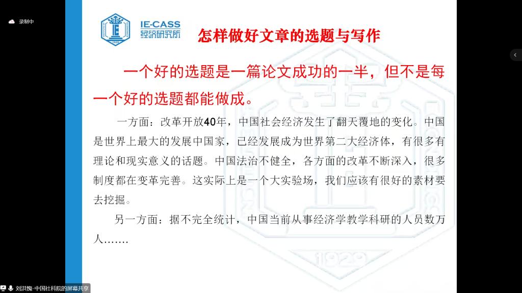 从文章选题、论证以及写作过程的注意事项等方面与亚搏中国官方网站_亚搏yabo(中国)师生分享了经济学论文的写作经验。他强调,选题对经济学文章十分重要,好的选题应该具有理论性和思想性,既要有理论上的合理性又能够体现作者的深度思考。刘洪愧副研究员结合自身经验提出了好的选题要从文献中、数据中、现实中来。