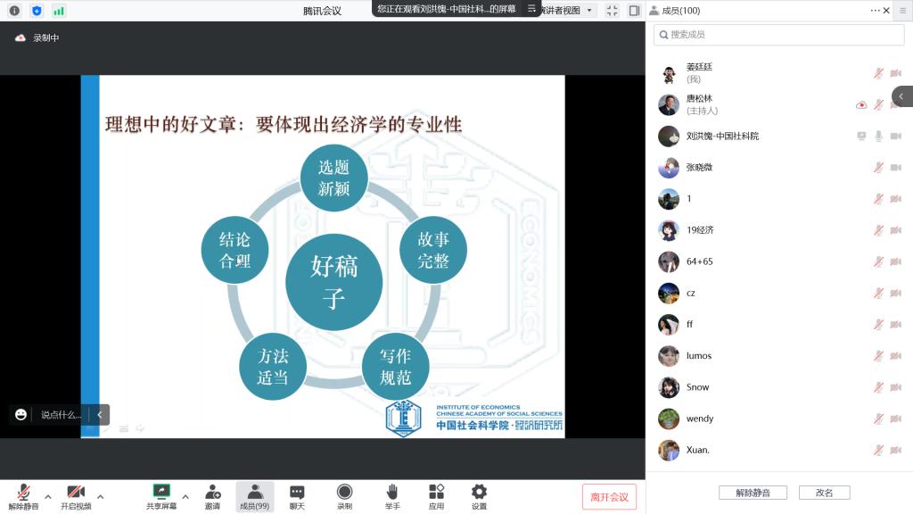 2022年11月3日,应学院邀请,中国社会科学院经济研究所副研究员、《经济学动态》责任编辑刘洪愧通过线上会议为亚搏中国官方网站_亚搏yabo(中国)师生作了“经济学论文选题与写作规范”的专题报告,院长唐松林主持了会议。