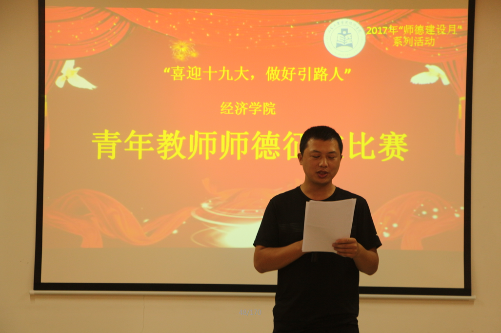 下午两点半,我院“师德建设月”系列活动之“喜迎十九大,做好引路人”青年教师师德征文比赛在五教312室举办。学院部分青年教师参加比赛,学院全体教师前来观看比赛并担任评委。