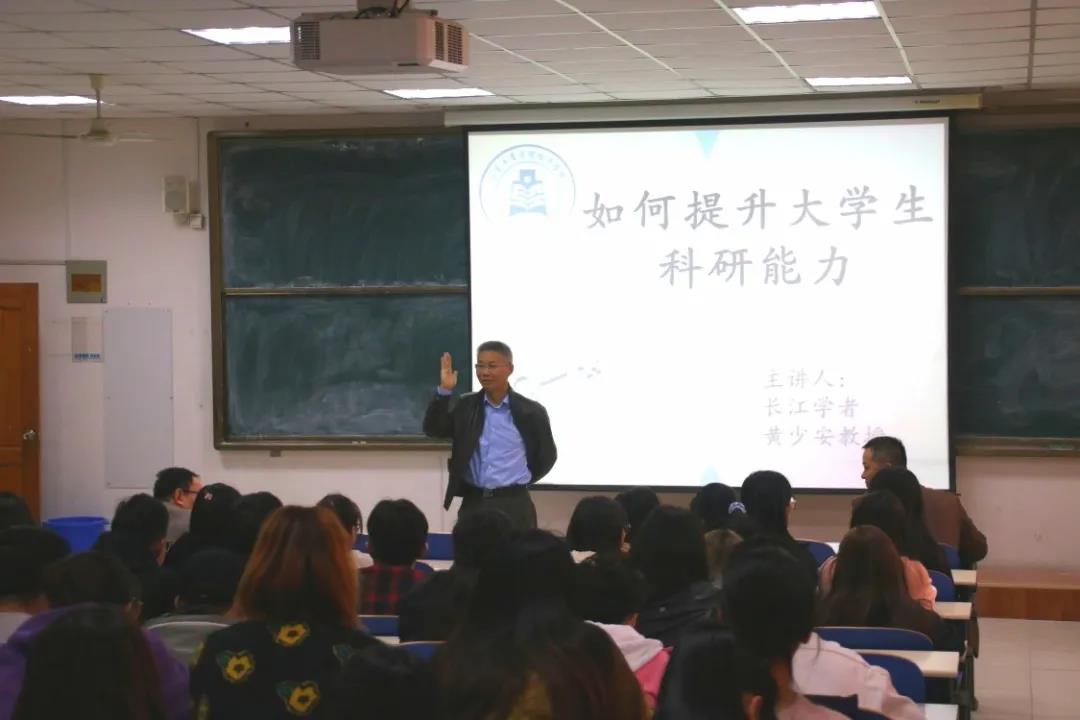 活动伊始,黄教授提出基础创新是在科学发现的基础上,创新的基点在自然界,是体力劳动与智力劳动的结合。随后从微观与宏观经济学、地理知识、失业率以及经济危机等方面分别讲述了我们作为经济人如何去了解、把握并分析这些问题。黄教授深入浅出地讲解着与大学生息息相关的科创问题,使同学们更好地了解科创项目的内容、流程,开拓了同学们的立项思路,引导同学们积极参与科创立项活动。活动最后,由副院长唐松林老师做总结发言,提出了科创是培养大学生创新意识的途径,大学生是创新主力军,应多参加科研活动,不断培养创新意识、提高创新能力。