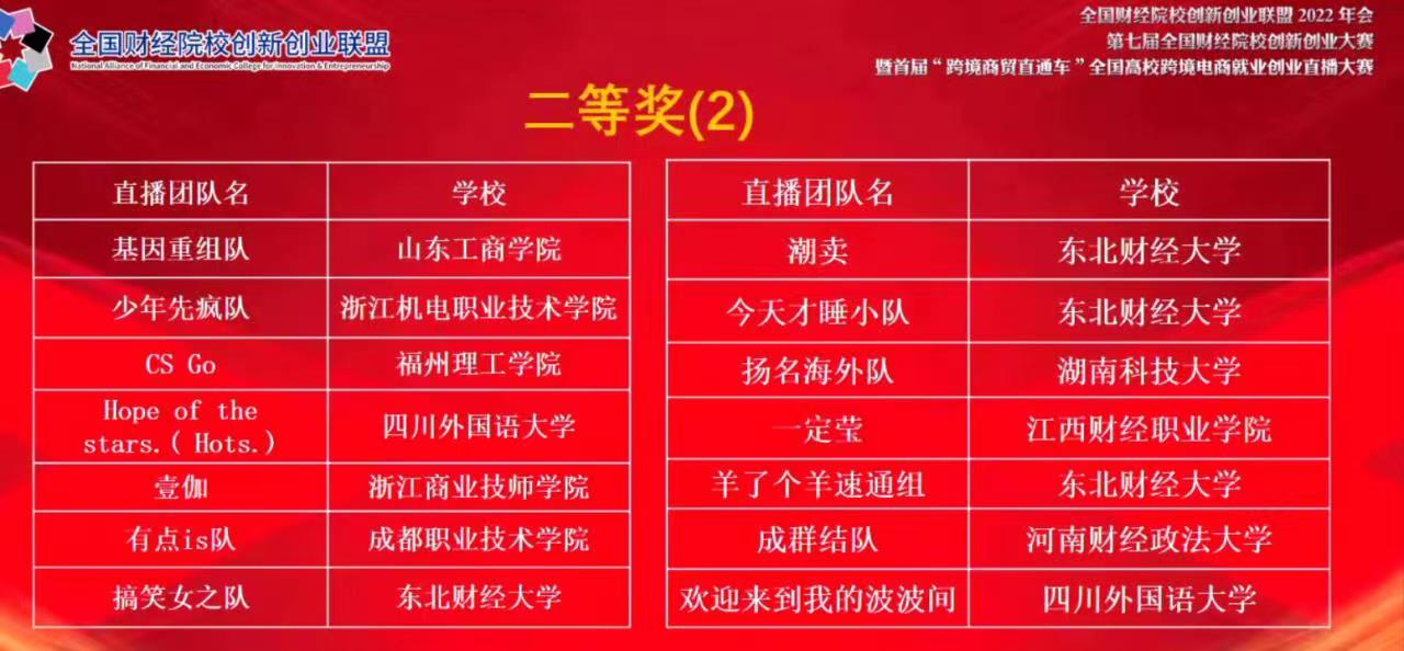 2022年12月11日,由全国普通高校毕业生就业创业指导委员会金融行业就指委指导,全国财经院校创新创业联盟主办,东北财经大学承办,阿里巴巴国际站支持的第七届全国财经院校就业创业大赛暨首届“跨境商贸直通车”全国高校跨境电商就业创业直播大赛正式落下帷幕。在本届赛事上,由亚搏中国官方网站_亚搏yabo(中国)国际经济与贸易专业教师姜书竹、王冰心、杨学坤、刘建芳等教师指导的三支队伍分获二、三等奖。其中,何俊霄、张宇琪、王鑫、Wafa等同学组成的“基因重组队”获大赛二等奖,梁楠、潘登、郝钿栋、张亚文等同学组成的“干啥都队”和朱雄辉、李咏、Kobby、易呈祥等同学组成的“Sivan’s star”队分别获得三等奖。姜书竹老师获得优秀主播导师。
