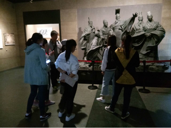 上午十点半,志愿者和同学们顺利到达烟台市博物馆,他们怀着对先人智慧的敬意走进了博物馆。在志愿者的一路带领和详细讲解下,同学们一起参观了山海古韵古代历史馆里的书画、雕塑以及恐龙峡谷,领略了世纪之路近代历史馆里陈列的自清末到新中国成立这一时期烟台地区的古物。同学们十分认真地倾听着讲解,同时仔细观察着文物的样式、结构,认真阅读着相关历史记载。
