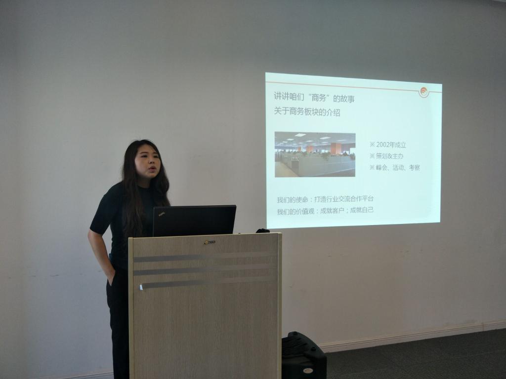 随后,工作人员带领同学们来到会议室,由公司经理为我们详细介绍企业的发展历程,主要业务和营销方式。易贸商务发展有限公司成立于1999年,总部设在上海,公司始于大宗商品领域的信息资讯服务,逐步发展至信息咨询、商务会展、交易经纪、供应链管理、融资服务、交易平台、云计算和大数据七大业务模块,覆盖大宗商品及其中下游200多个垂直细分行业,为B2B垂直行业提供电子商务解决方案。