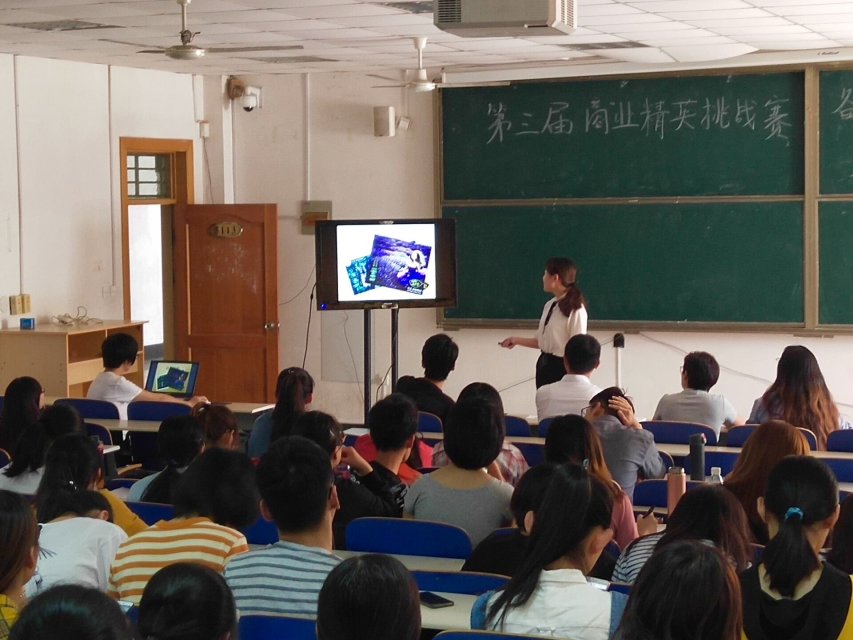本次汇报会一共有13支队伍参与,每个团队派了两名代表以PPT的形式简要的介绍了他们的参展公司及参展产品的基本情况,并汇报了比赛期间各个环节的完成进度,包括活动布展、产品发布会、全英文模拟谈判的思路和小组分工以及目前的进展情况。