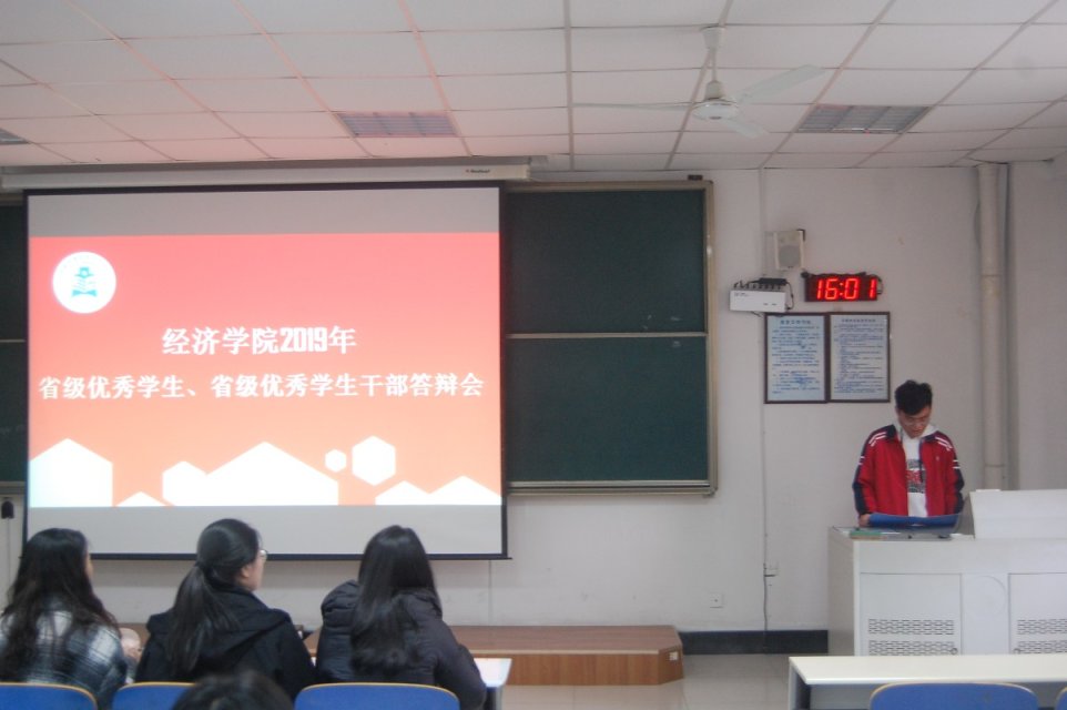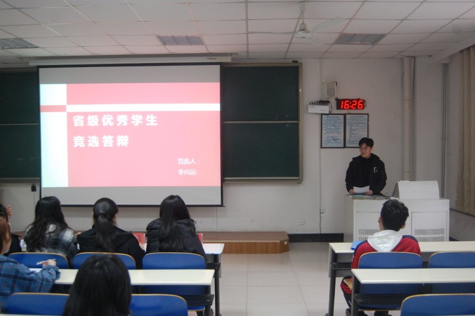 答辩开始前由主持人介绍了本次省级优秀学生、省级优秀学生干部评选流程、基本情况及评审规则,秉持公平、公正、公开的原则进行评选。各项规则介绍完毕后,各候选人依次以PPT的形式从个人思想、学业成绩、社会实践、获奖情况等方面进行答辩展示。答辩会结束后,经由老师和学生代表们的打分汇总,最终拟定国贸162班李向远为省级优秀学生,经济163班钟云为省级优秀学生干部。